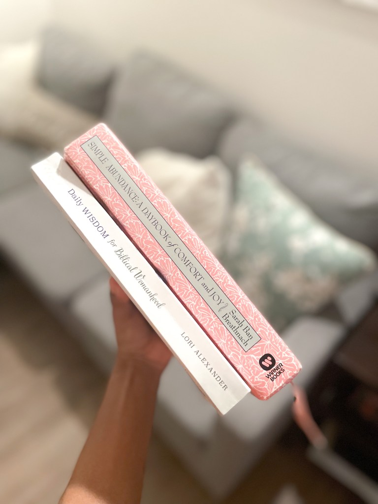 My favorite books to read before bed are Daily Wisdom for Biblical Womanhood by Lori Alexander (buy on Amazon here) and Simple Abundance by Sarah Ban Breathnach (buy on Amazon here) .